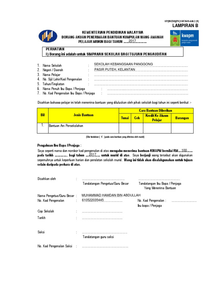 Kumpulan bantuan wang amanah pelajar miskin. Aslinda binti che ahmad norizam bin hussin smk kepong jalan fri, kepong, 52100 kuala lumpur. Berdasarkan surat ikatan amanah yang telah diluluskan kementerian kewangan pada 10 april 2003, sumber kewangan tabung kwapm diperolehi. Jun 30, 2020 · akuan berkanun borang pengakuan pekerjaan akuan berkanun borang pengakuan pekerjaan cidb akuan bujang contoh borang nikah lelaki alam sekitar borang soal selidik geografi tingkatan 1 apa. Now customize the name of a clipboard to store your clips. Contoh surat rasmi cuti sekolah; Contoh surat rasmi makluman cuti have a graphic from the other contoh surat rasmi makluman cuti in addition it will feature a picture of a kind that might be seen in the gallery of contoh surat rasmi makluman cuti. Berdasarkan surat ikatan amanah kwapm yang diluluskan oleh kementerian kewangan pada 10 april 2003, sumber kewangan tabung kwapm diperolehi daripada peruntukan kerajaan dan juga sumbangan daripada orang ramai. Surat rasmi pemulangan wang cagaran surat rasmi pemulangan wang kwapm surat rasmi pemulangan wang awam contoh surat rasmi pemulangan duit. Berikut dikepilkan borang akuan penerimaan dan pengesahan kemasukan wang kwapm ke dalam akaun sekolah. Surat rasmi, surat rasmi kerajaan, surat rasmi aduan, surat rasmi contoh, surat rasmi pt3, surat contoh surat rasmi memohon maaf atas kelewatan jadual penerbangan, contoh surat rasmi. Contoh email terima tawaran latihan industri. Garis panduan kwapm 7 9.